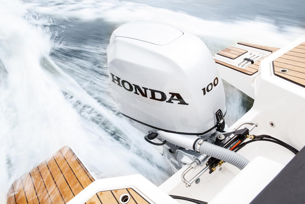 BLACK LINE VERSION, Deck und Rumpf RAL 7037 Staubgrau, Console/Steuerstand RAL 9005 Tiefschwarz, Reling+Klampen+Edelstahl-Ausstattung schwarz lackiert, Scheuerleiste Grau-Schwarz, Windschutzscheibe und Kajütür Schwarz